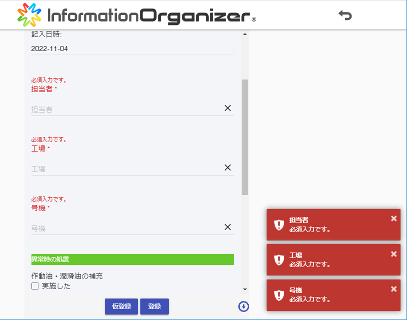 必須項目が入力されていない、入力した数字の桁数が設定と合っていないなど、登録内容にエラーがあった場合は、[登録]または[仮登録]を選択したときにエラーの内容がポップアップで通知されます。