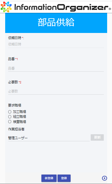 帳票アプリの設定によっては、[連続登録]を選択した場合でも完了メッセージが表示されないときがあります。 - 入力画面が表示されるので、続けて実績を登録します。