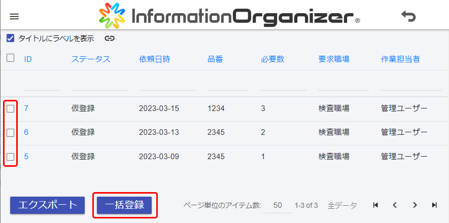 一括登録が可能になっている帳票アプリでは、仮登録されている複数の実績を選択して、一括で登録できます。また、一括登録するときに、項目の入力が必要な場合があります。項目に入力した内容も、一括登録と同時に登録できます。