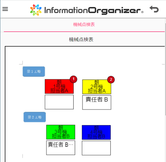 たとえば、機械の点検結果を登録する帳票アプリがある場合、モニターモードを使用して点検状況(未点検・点検中・点検完了)を示す色を決めておくと、色を見て点検状況がわかるようになります。色を表示する「ボックス」は自由に配置できます。機械が複数ある場合は「マップ」と呼ばれるスペースにボックスを実際の機械と同じ位置に配置すると、ボックスの色と配置でそれぞれの機械の点検状況を確認できます。