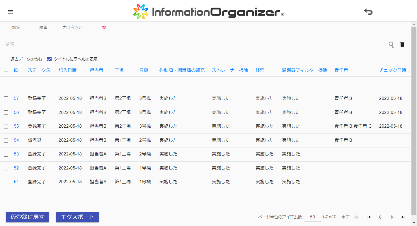 2号機:黄色の表示は、責任者が入力結果の一部の項目をチェックしたことを示しています。また、ボックスの右上に表示されている件数は、仮登録の件数を示しています。