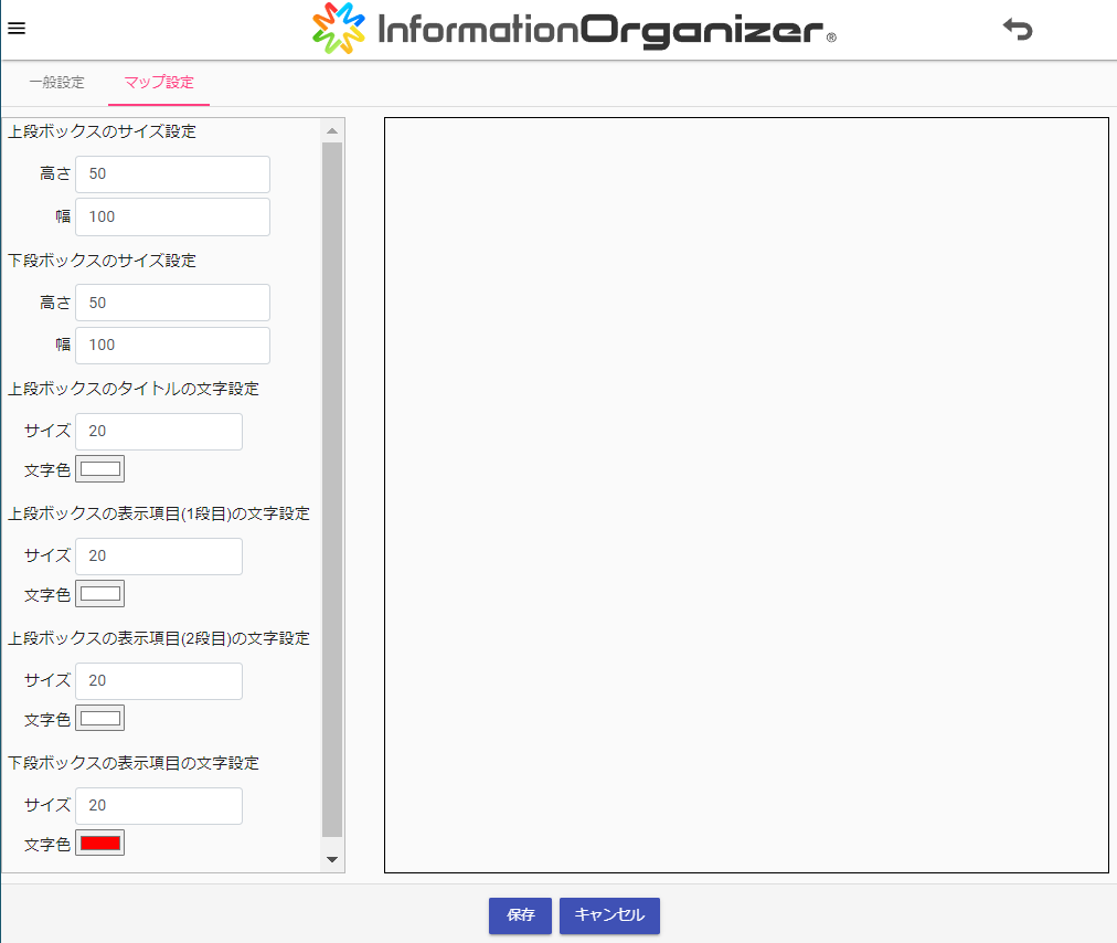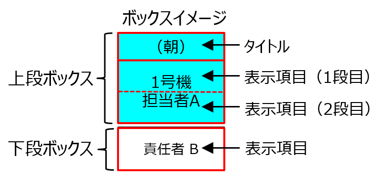 | 上段ボックスの表示項目(1段目)の文字設定 | 上段ボックスの1段目に表示する文字のサイズと色を設定する |