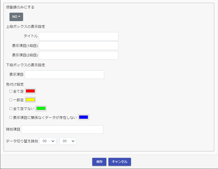 | 仮登録のみにする | [YES]の場合は、仮登録のデータだけが色付け表示される [NO]の場合は、仮登録と登録の両方のデータが色付け表示される |