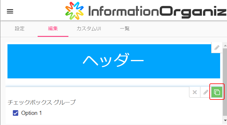 5.2.3 帳票フォームのアプリパーツを複製する メニューから[管理モード]を選択します。 編集したい帳票アプリを選択します。 「編集」タブを選択します。 複製したいアプリパーツの[]を選択します。選択したアプリパーツの下に、複製したアプリパーツが表示されます。