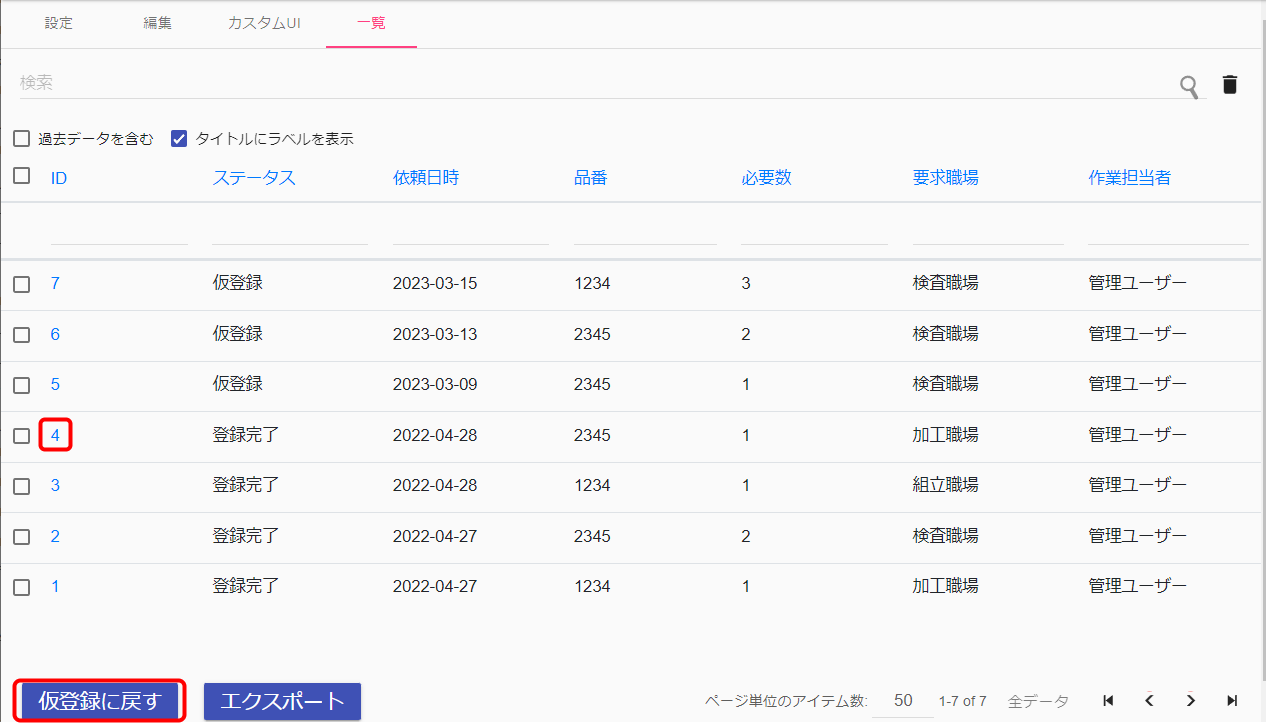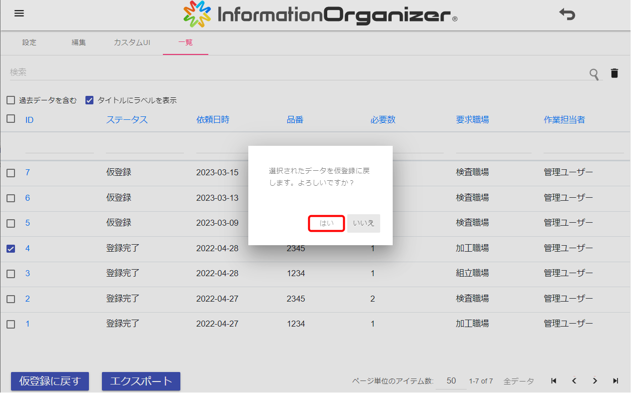 5.7 帳票アプリに登録された実績を仮登録に戻す 登録された実績を仮登録に戻すことで、標準ユーザーが帳票フォームを再び編集できるようになります。 メニューから[管理モード]を選択します。 実績を仮登録に戻すアプリを選択します。 「一覧」タブを選択します。 ID番号を選択して[仮登録に戻す]を選択します。 確認画面が表示されるので[はい]を選択します。[いいえ]を選択すると一覧画面に戻ります。