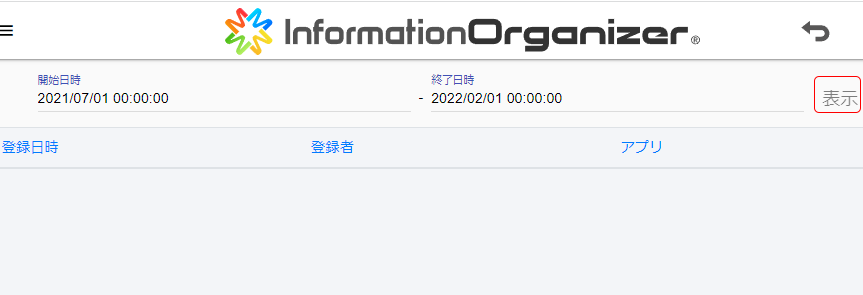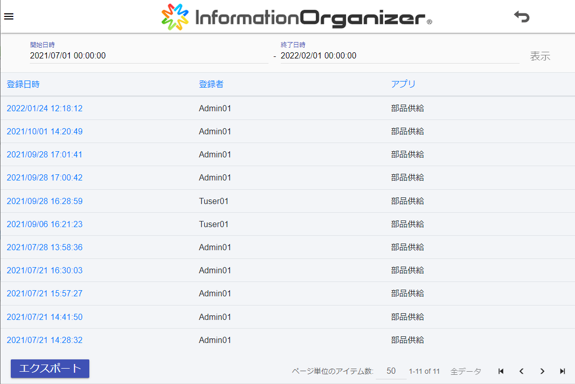 開始日時と終了日時のどちらかが未入力の場合は、エラーが表示されて実行しません。 - 各実績の登録日時を選択すると、実績画面が表示されます。