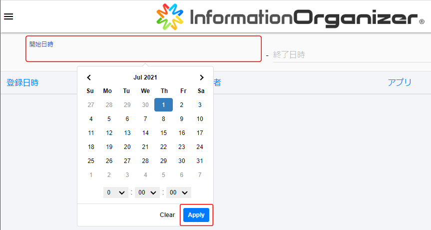 帳票アプリは、複数選択できます。 - 開始日時の入力フォームを選択して、日時を設定して[Apply]で決定します。