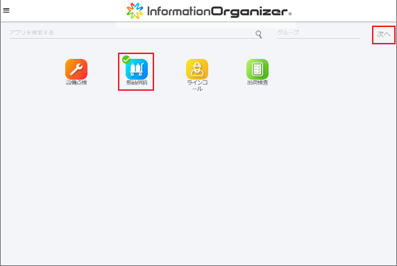 - 検索したい帳票アプリを選択して、右上の[次へ]を選択します。