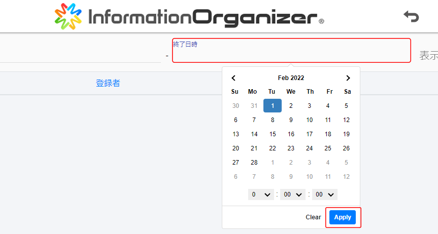 - 終了日時の入力フォームを選択して、日時を設定して[Apply]で決定します。