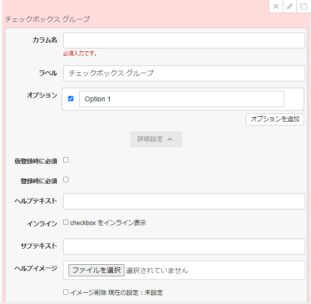 仮登録時に必須:仮登録するときに⼊⼒必須フィールドとするか。設定タブに表示される「仮登録を有効にする」が[NO]に設定されている場合は、表示されない