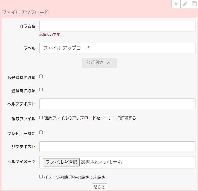 ヘルプイメージ:ラベル横の画像アイコンに使⽤するファイルを選択する。「イメージ削除 」にチェックを入れると、設定しているヘルプイメージのファイルを削除できる