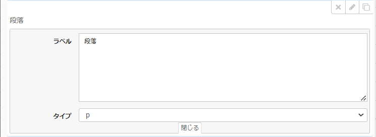 7.6 段落 帳票フォームにテキストが表示できます。 ラベル:項目タイトル(100文字まで入力可能) タイプ:段落の種類(p:段落/h:見出し/a:URLのハイパーリンク) URL:タイプで「a」を選択すると、入力欄が表示される。URLを入力する