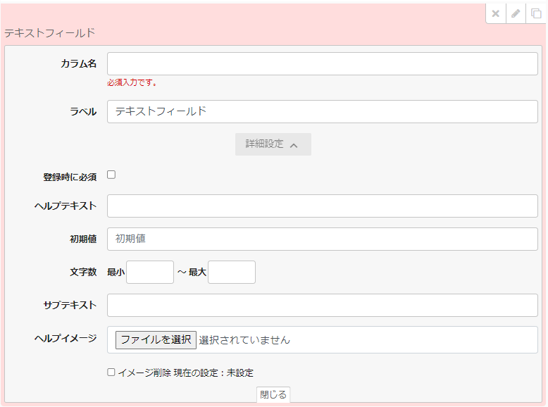 文字数:入力できる最小文字数と最大文字数を設定(1~100の数字が入力可能)