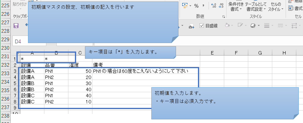 - キー項目に設定する項目には、表の1列目に「*」(半角のアスタリスク)を入力します。
