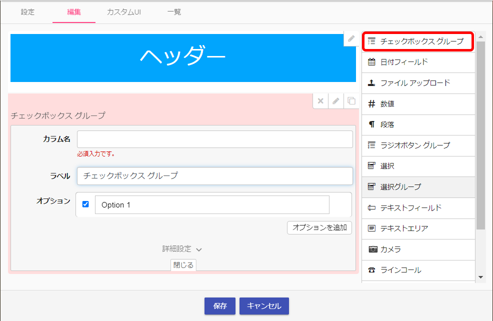 各アプリパーツの詳細は、「7 帳票フォーム作成」を参照してください。 - アプリパーツの内容を設定します。