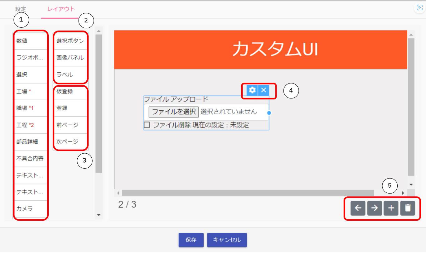 | ② | 選択ボタン | カスタマイズの設定で配置できる部品 |