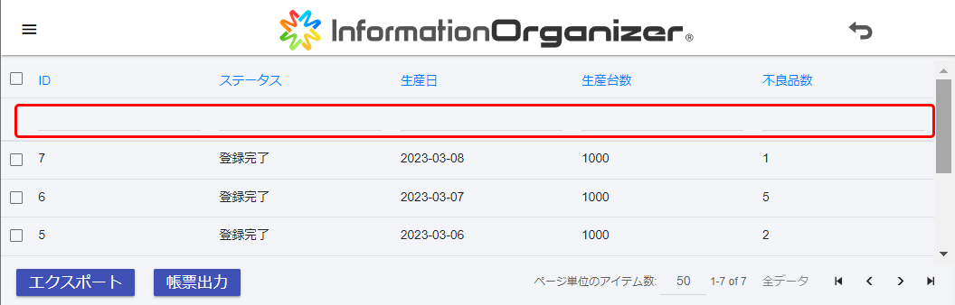 5.5 帳票アプリに登録された実績を検索する 項目ごとに検索条件を設定して、実績を検索できます。複数の検索条件を設定すると、AND検索ができます。 メニューから[管理モード]を選択します。 実績を確認したい帳票アプリを選択します。 ⼀覧タブを選択します。実績一覧が表示されます。 検索欄に検索条件を入力します。 項目ごとに検索条件を入力できます。 検索条件が含まれる実績が表示されます。